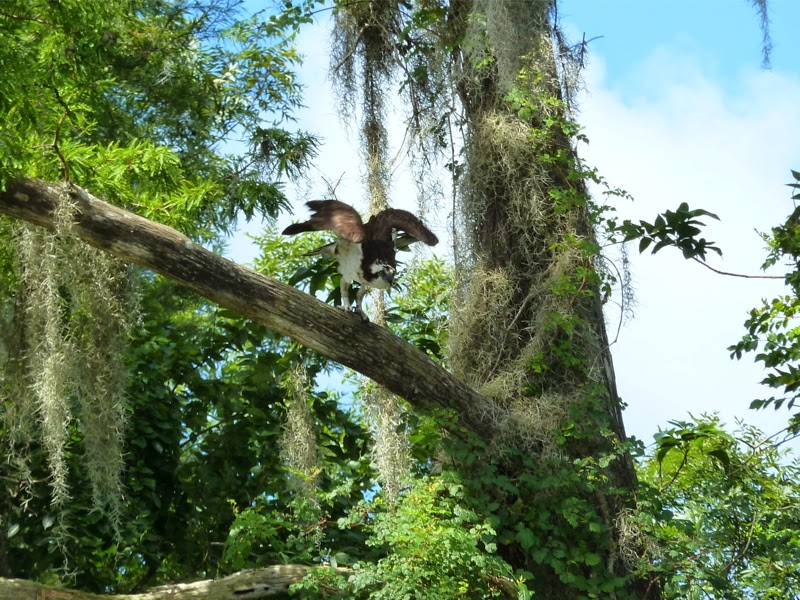 Het is best druk op de weg, rond Downtown staan we zelfs in de file. Omdat we uiterlijk 20 min van te voren aanwezig moeten zijn, wordt het qua tijd een beetje krap. Het is toch zo'n 5 kwartier rijden zonder oponthoud. We rijden 9.35 het State Park in en betalen $ 6,00 entree. Het is strak blauw en dus heel zonnig, we smeren nog wat extra zonnebrand en lopen richting het vertrekpunt van de boot. Nadat we de tickets gekocht hebben, kunnen we al snel op stappen. De boot is slechts voor 20% gevuld, dus ruimte genoeg om te zitten en te kijken. De Nature Cruise is een twee uur durende boottocht over de de St. Johns River.